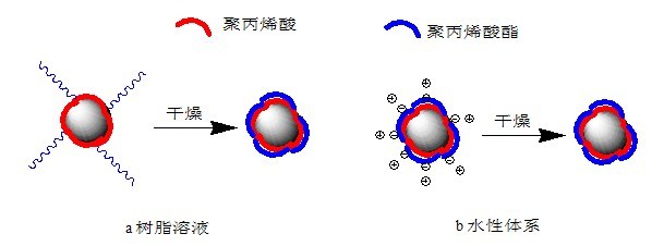 HT A20分子中的錨固部分由(甲基)丙烯酸、磷酸的均聚物或共聚物組成,通過(guò)和鈦白粉間的吸引力(配位作用、共價(jià)鍵)吸附在粒子表面,將粒子隔離開(kāi)來(lái)。和樹(shù)脂相容的穩(wěn)定部分由丙烯酸酯、甲氧基聚丙二醇丙烯酸酯無(wú)規(guī)共聚物組成,賦予表面改性后的鈦白粉粒子良好的再分散性,并且能穩(wěn)定均勻分散在樹(shù)脂溶液和溶劑揮發(fā)后的樹(shù)脂中。在體系干燥過(guò)程中以及干燥后,和樹(shù)脂相容的部分能包覆在鈦白粉粒子表面,防止粒子聚集,使得鈦白粉粒子在樹(shù)脂中能均勻分散。圖2表示改性劑HT A20處理鈦白粉粒子后,HT A20在粒子表面的形態(tài)。圖2a表示在樹(shù)脂溶液或溶劑中,干燥前,改性劑的錨固部分和鈦白粉粒子間通過(guò)共價(jià)鍵、配位鍵結(jié)合在粒子表面上,聚丙烯酸酯部分充分伸展,通過(guò)空間位阻作用穩(wěn)定粒子;干燥后,聚丙烯酸酯部分包覆在粒子上或和樹(shù)脂基體互相滲透。圖2b表示在水性體系中,干燥前,改性劑的聚丙烯酸錨固部分和鈦白粉粒子間通過(guò)共價(jià)鍵、配位鍵結(jié)合在粒子表面上,依靠靜電斥力穩(wěn)定粒子;干燥后,聚丙烯酸酯部分包覆在粒子上或和樹(shù)脂互相滲透。可見(jiàn),雙親型嵌段聚合物改性劑HT A20對(duì)鈦白粉進(jìn)行有機(jī)表面處理后,在有機(jī)溶劑體系和水性體系中,都能提高鈦白粉在介質(zhì)中的分散穩(wěn)定性并改善鈦白粉和樹(shù)脂的相容性。
